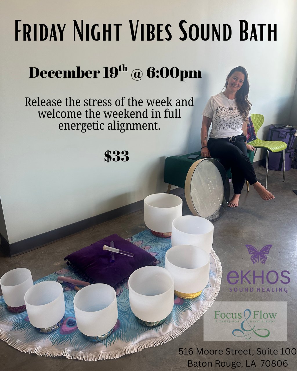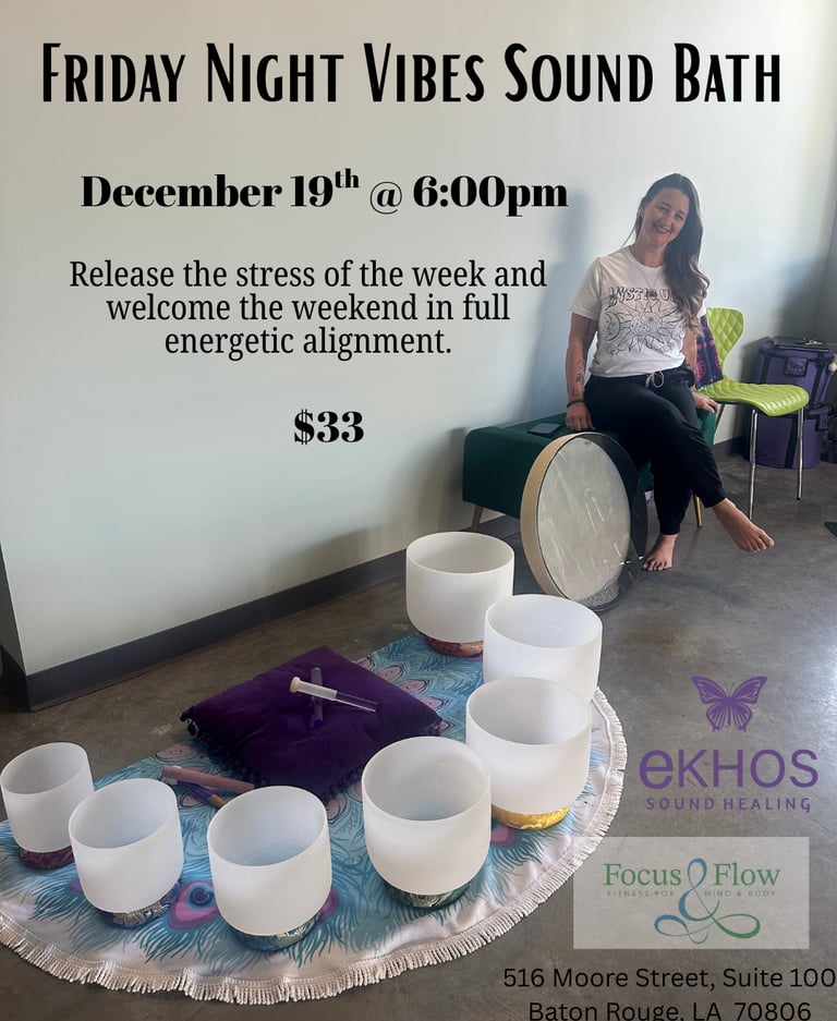 Join Ekhos Sound Healing at Focus and Flow for Friday Night Vibes, a deeply restorative sound bath to help you release the stress of the week and welcome the weekend in full energetic alignment.