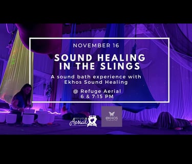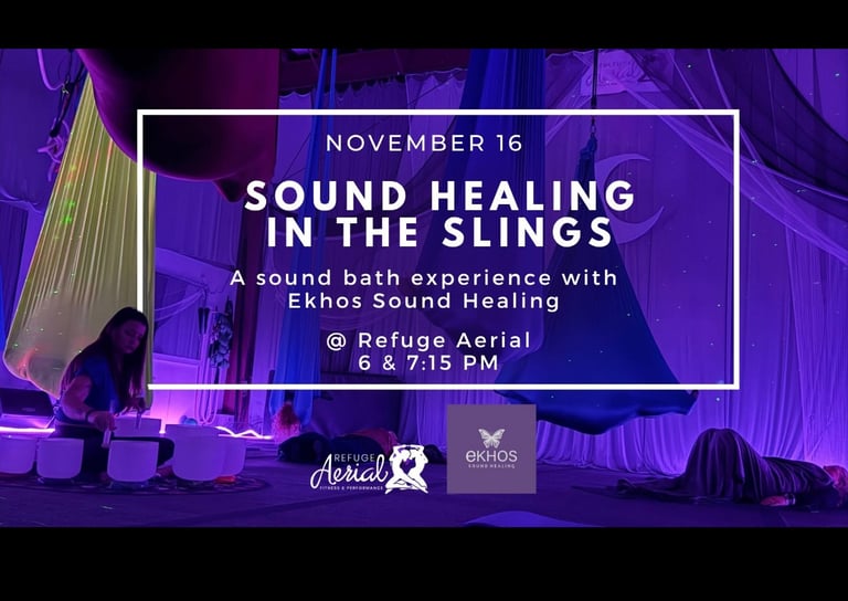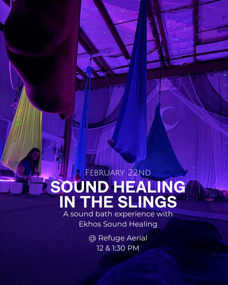 Step into a truly unique and immersive sound healing journey at Refuge Aerial, where the vibrations of crystal singing bowls will surround you as you float, cocooned in aerial silks. Nestled in weightless comfort, you'll be gently suspended above the ground, enveloped in soft fabric while soothing sounds and celestial lights transport you into deep relaxation. With the lights low and stars illuminating the space, the experience is pure magic - a chance to release, reset, and elevate your energy like never before.