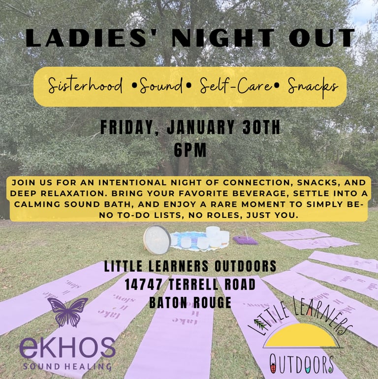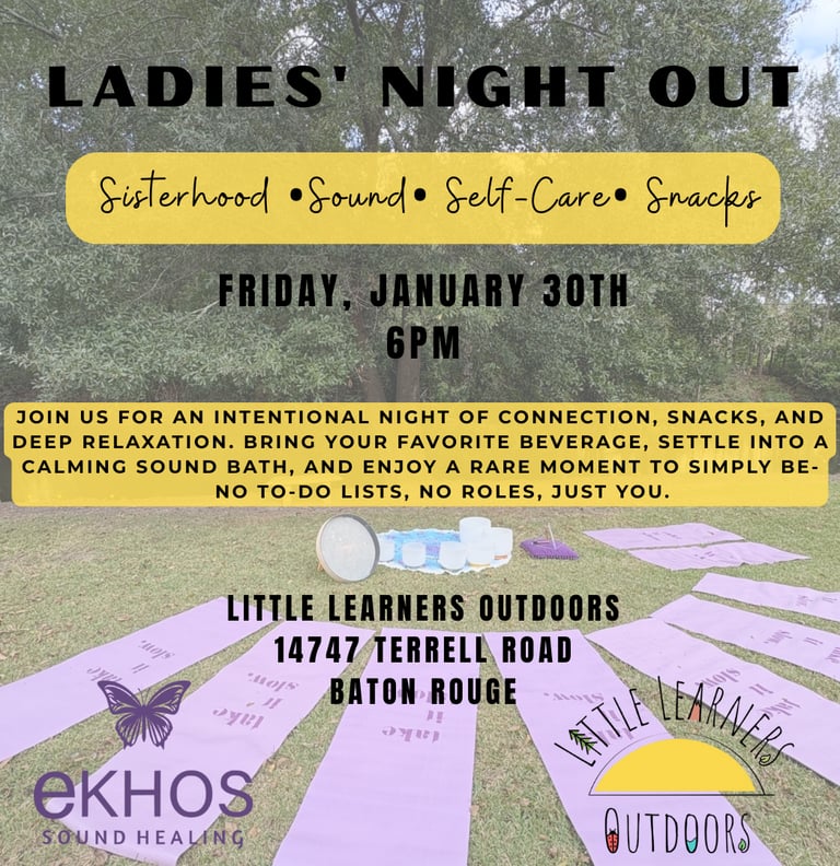 Join us for a Ladies' Night Out at Little Learners Outdoors- an evening created just for moms to slow down, connect, and refill their cups. This cozy Friday night gathering invites women to step away from the busyness of everyday life and enjoy meaningful connection, snacks, and a deeply relaxing sound bath experience.