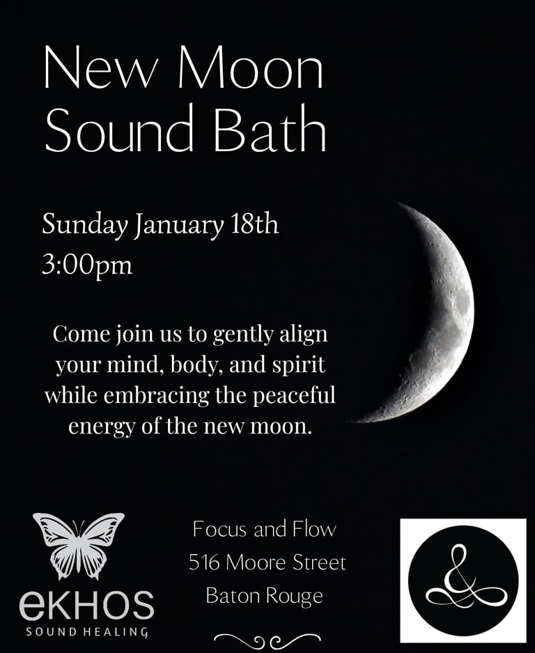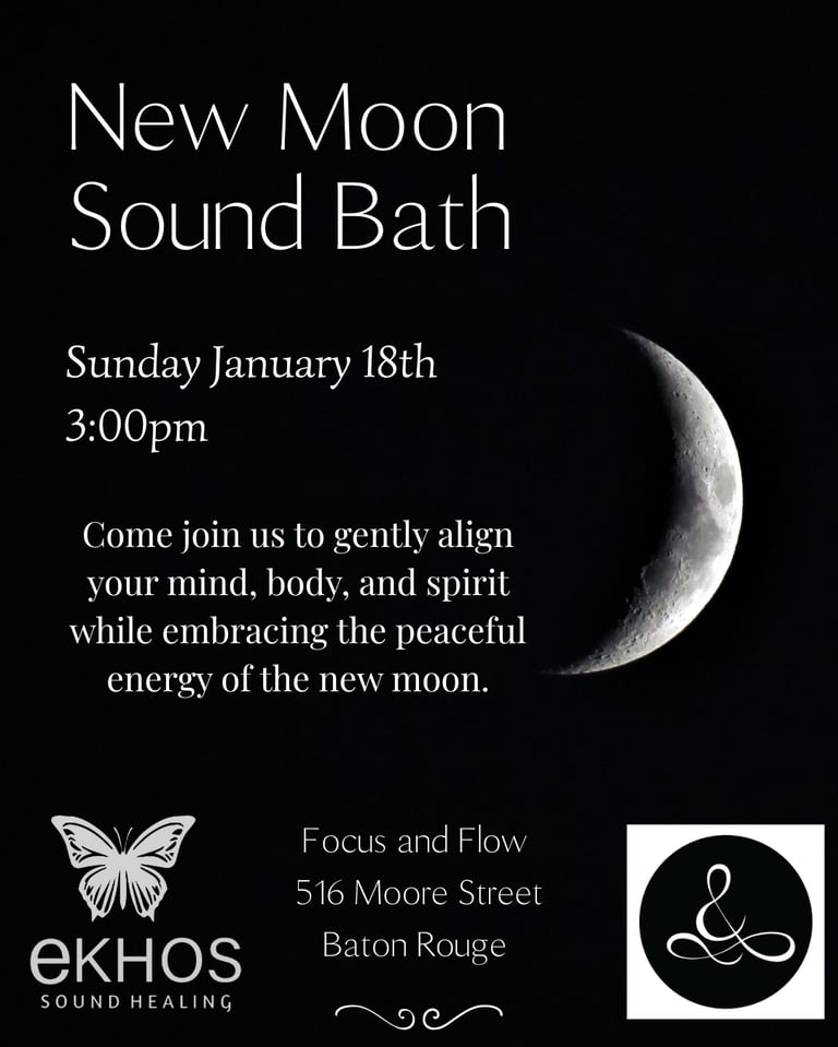 Join me at Focus and Flow for a New Moon Sound Bath at 3:00pm, a sacred space to set fresh intentions and embrace new beginnings. The new moon is a powerful time for reflection, renewal, and planting the seeds of your deepest desires. As the soothing vibrations of crystal singing bowls and ocean waves wash over you, allow yourself to release what no longer serves you and invite in clarity, balance, and inspiration for the cycle ahead.