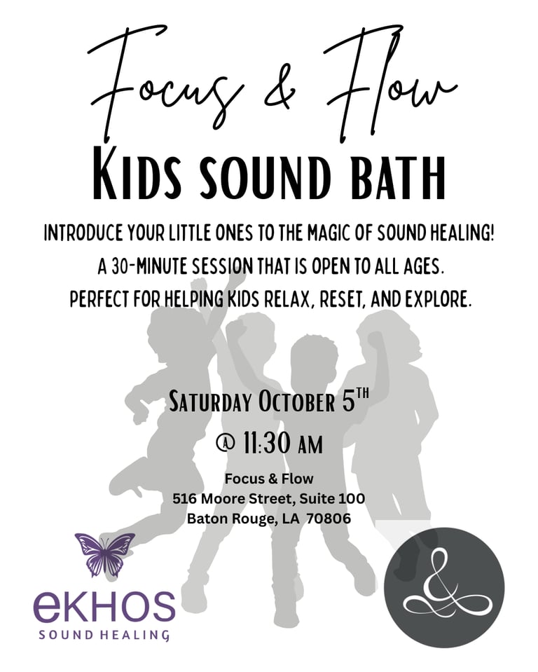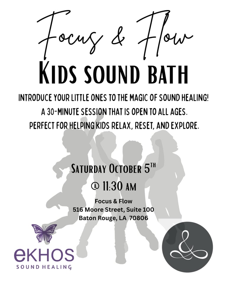 Join Ekhos Sound Healing on Sunday, October 5th, for a special Kids Sound Bath- a playful and peaceful introduction to the healing power of sound. This 30-minute session is designed to help children unwind, reset, and connect through gentle vibrations and mindful listening.