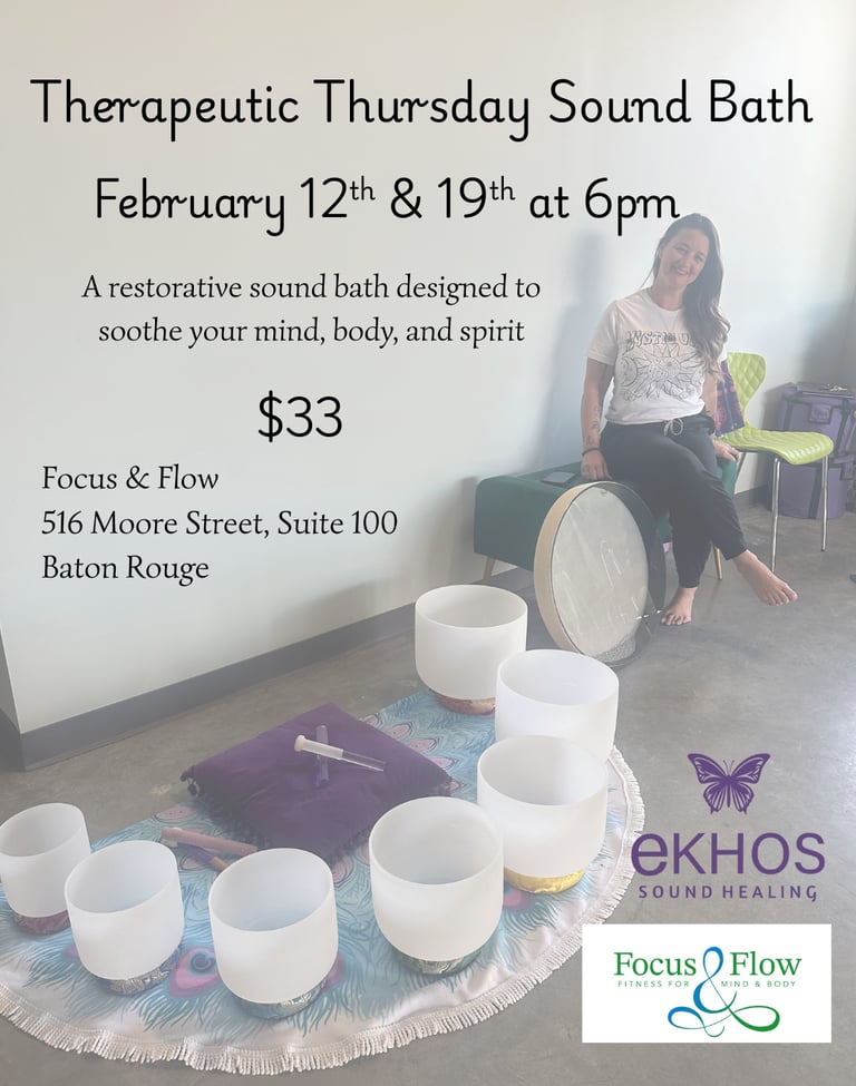 Join Ekhos Sound Healing on Thursday, February 12th & 19th at Focus and Flow for Therapeutic Thursday, a restorative sound bath designed to soothe your mind, body, and spirit.